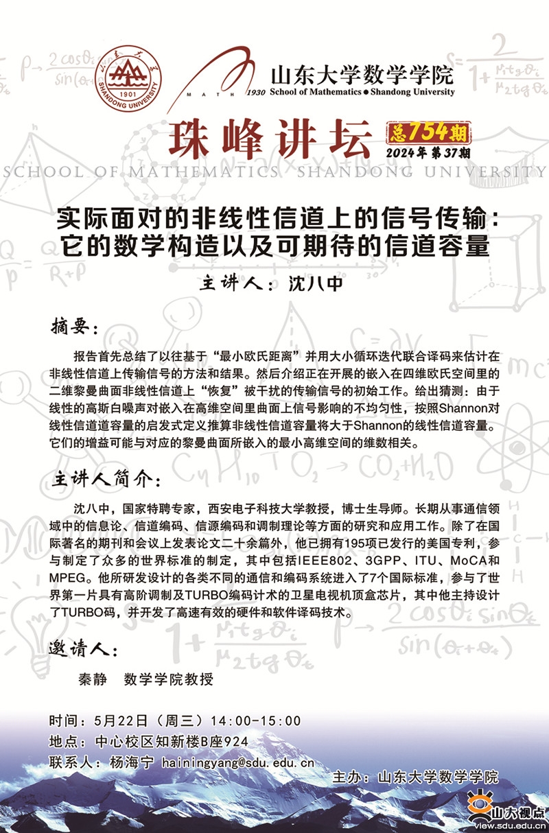 数学学院珠峰讲坛第754期 | 实际面对的非线性信道上的信号传输:它的数学构造以及可期待的信道容量