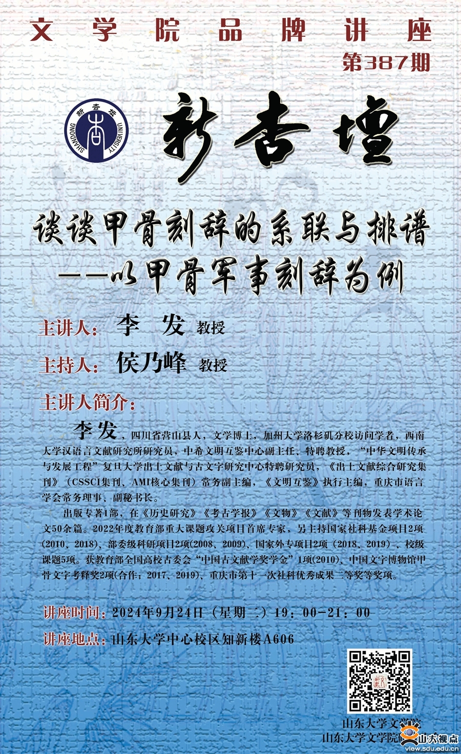 甲骨刻辞“断烂朝报”、文辞简省,缺乏同一时代的传世文献比勘,故辞义理解往往令人莫衷一是。因此,研究时利用“系联”和“排谱”手段至关重要。“系联”指将具有相同关键词的材料排比关联,相互发明;“排谱”指围绕同一主题的事件按时间先后排列,形成事件的日谱、月谱或年谱,尽可能呈现事件的清晰发展过程。讲座主要以甲骨军事刻辞为例,谈谈“系联”和“排谱”在甲骨刻辞研究中的运用。