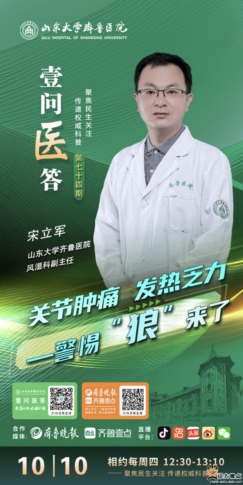 [本站讯]10月10日12:30,山东大学齐鲁医院风湿科副主任宋立军将在“壹问医答”直播间,详细解读系统性红斑狼疮的相关医学知识。关注山东大学齐鲁医院微信视频号和齐鲁壹点客户端,了解更多医学知识。