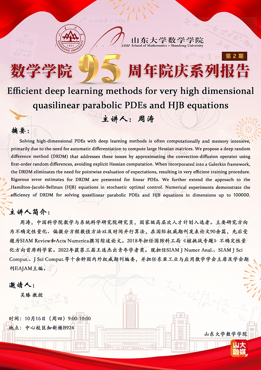 数学学院95周年院庆系列报告第2期:Efficient deep learning methods for very high dimensional quasilinear parabolic PDEs and HJB equations
