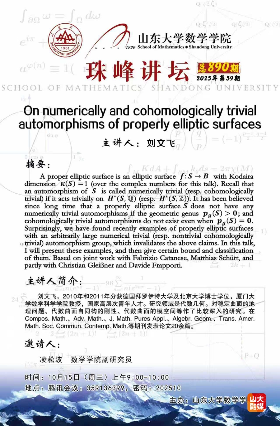 数学学院珠峰讲坛第890期:On numerically and cohomologically trivial automorphisms of properly elliptic surfaces