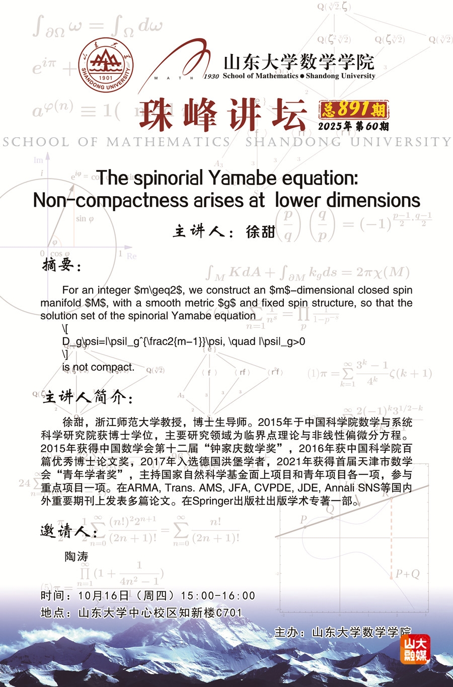 数学学院珠峰讲坛第891期:The spinorial Yamabe equation:Non-compactness arises at lower dimensions