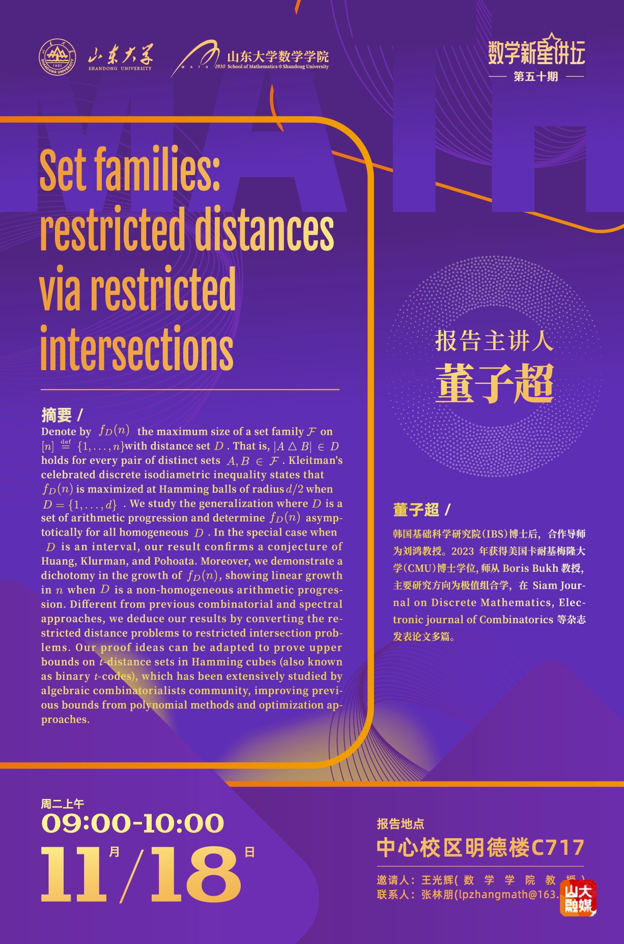 数学学院新星讲坛第50期:Set families:restricted distances via restricted intersections