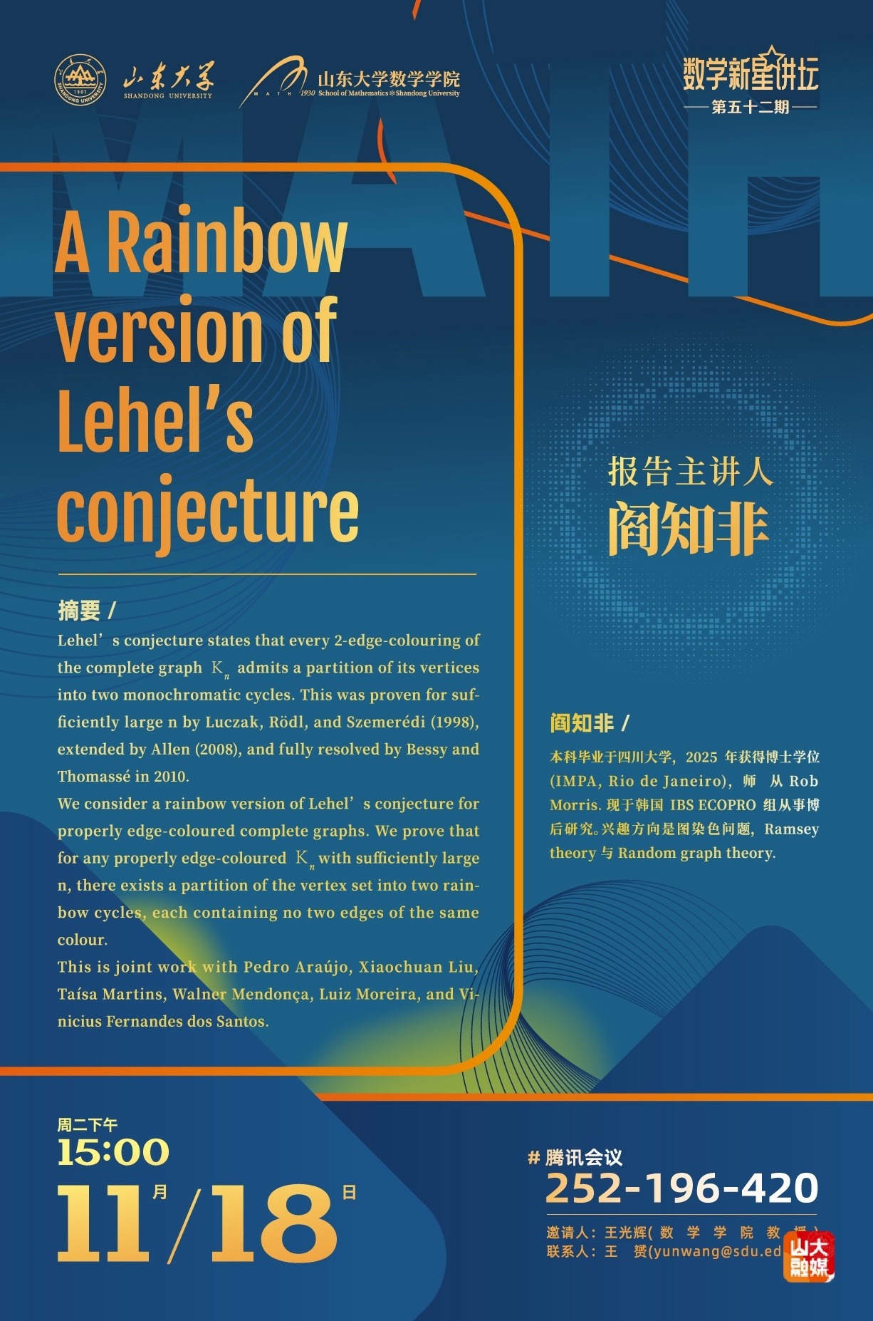数学学院新星讲坛第52期:A Rainbow version of Lehel's conjecture