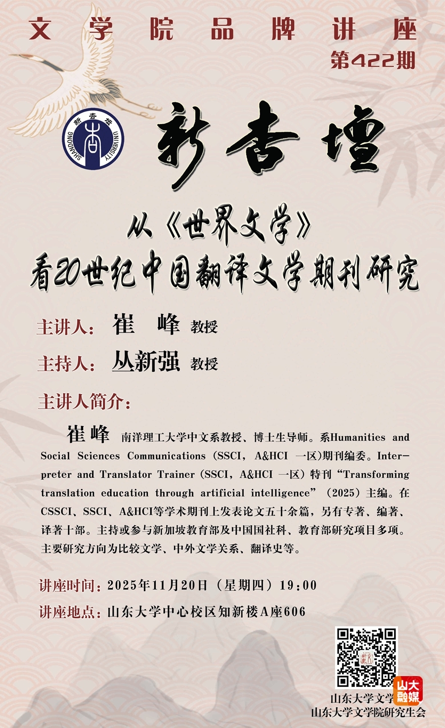 崔峰,南洋理工大学中文系教授、博士生导师。Humanities and Social Sciences Communications(SSCI, A&HCI 一区)期刊编委。Interpreter and Translator Trainer(SSCI, A&HCI 一区) 特刊“Transforming translation education through artificial intelligence”(2025)主编。在CSSCI、SSCI、A&HCI等学术期刊上发表论文五十余篇,另有专著、编著、译著十部。主持或参与新加坡教育部及中国国社科、教育部研究项目多项。主要研究方向为比较文学、中外文学关系、翻译史等。