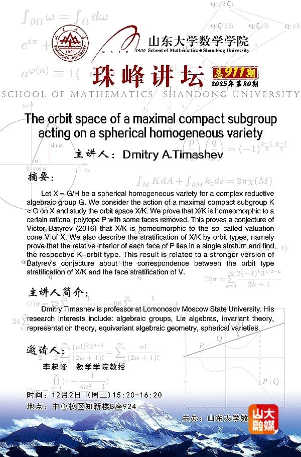 数学学院珠峰讲坛第911期:The orbit space of a maximal compact subgroup acting on a spherical homogeneous variety