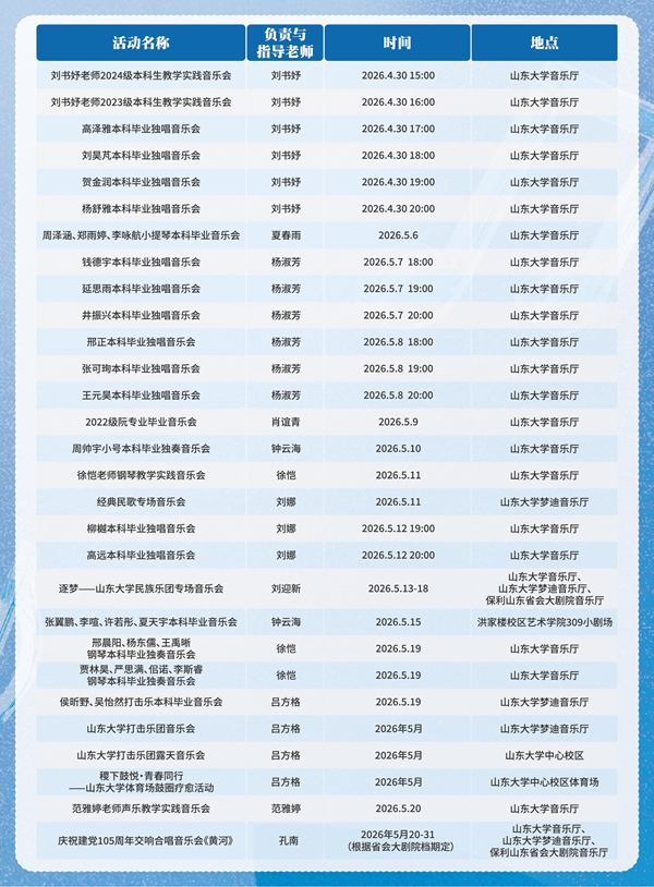 [本站讯]近日,山东大学2026艺术展演季正式启幕。2025-2026学年春季学期,艺术学院计划举办各类艺术展演活动115场,其中包括音乐演出84场、美术与艺术设计展19场、青岛校区美育活动12场。通过多元化的艺术实践,深化美育育人内涵,切实提升学生的审美素养与创新能力。