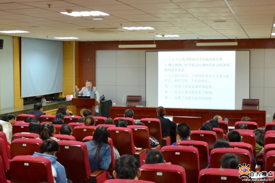 [本站讯]10月23日,经济学院齐鲁税务讲坛第38期在中心校区举行。中国人民大学财政金融学院朱青教授为师生作了题为“十九大后我国税制改革的走向及面临的问题”的学术报告。报告由经济学院副院长石绍宾主持。
