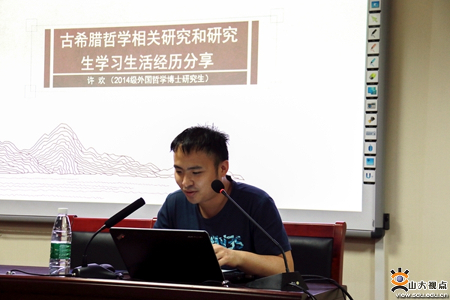 [本站讯]5月27日,第14期(总第671期)“海右”博士生学术论坛在知新楼举行。此次论坛由山东大学研究生院、党委研究生工作部主办,哲学与社会发展学院承办,是2019年“海右”优秀博士毕业生报告月活动之一。论坛邀请2019年优秀博士毕业生许欢作了古希腊哲学相关研究及研究生学习生活经历分享,傅永军教授受邀做报告点评嘉宾。