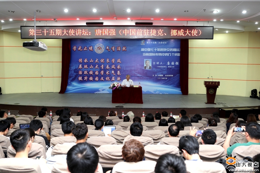 [本站讯]6月4日,由威海校区团委与东北亚学院联合主办的第三十五期“大使讲坛”于玲珑学堂举行。中国前驻捷克、挪威大使唐国强为校区师生作了题为“新中国七十年的外交历程以及当前国际形势中的几个问题”的报告。威海校区党工委副书记赵玉璞主持讲坛。威海校区团委、东北亚学院相关负责人及各院师生代表聆听报告。
