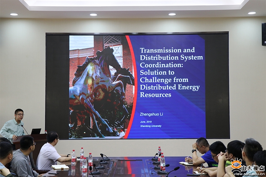 [本站讯]6月27日,由电气工程学院主办的研究生学术讲座在兴隆山校区举行。本次讲座邀请到了南卫理公会大学李正烁研究助理教授,讲座主题是Transmission and Distribution System Coordination: Solution to Challenges from Distributed Energy Resources(输配电系统协调:应对分布式能源的挑战)。电气工程学院杨明教授主持讲座。