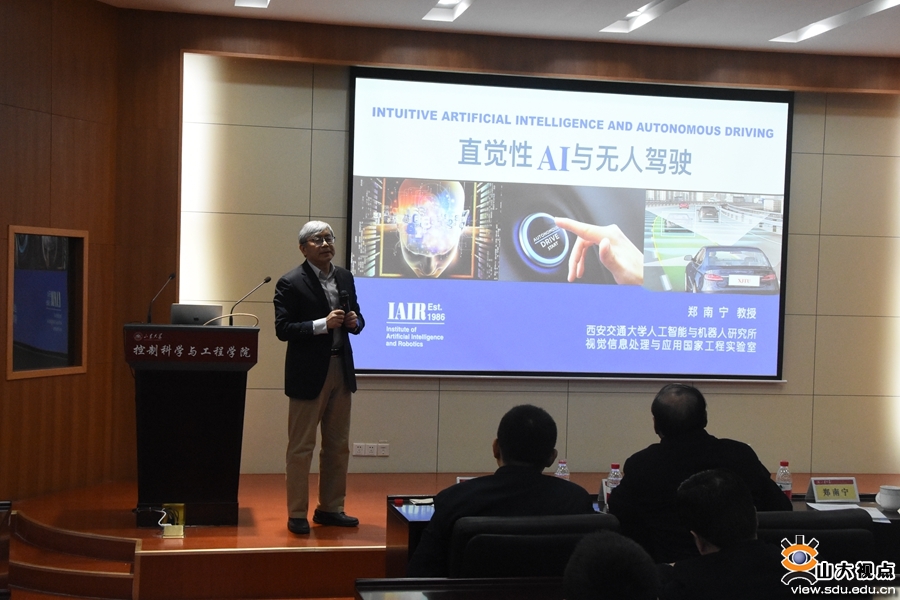 郑南宁院士为山大师生作了题为《直觉性AI与无人驾驶》的学术报告。郑南宁院士在报告中首先讲述了人工智能发展的四个阶段,分析了符号主义、联结主义、行为主义、贝叶斯方法、类推学派等目前人工智能主要学派的特点;分析了符号化人工智能和深度学习的局限性,经典人工智能基本理论框架存在的“条件问题”和“分歧问题”。他认为,根据人脑的独特特性,基于脑认知机理和神经科学,融合机器学习,构建出一种类脑的“学习机器”,而不是单一的“机器学习”——直觉性AI。直觉性AI具备直接推理、认知推理、因果模型,它可以对环境中的所有对象进行特征识别,并且进行长期记忆;梳理各个对象之间存在的关系,并对它们之间的相互作用进行描述;可以基于想象力行为模型,在采取具体行动之前,想象或者预测可能带来的后果。为实现这些功能,需要建立直观物理层面的推理基本框架,构造一个内部预测模型,基于环境特征,提取有用信息,以此规划想象行为,实现最大化任务效率。他在报告中表示,无人驾驶是直觉性AI应用的重要场景。无人驾驶需要面对交通场景的不确定性、脆弱性和开放性,面临场景的“可靠感知”、“预行为”理解、“意外遭遇”应对、人车自然交互和网络安全等五大技术难题。无人驾驶要根据人类视觉关注选择、组织、整合、编码的基本机制,把场景感知和情景认知结合起来,融合先进知识概念,实现记忆学习,构建模型,实现在环境感知数据获取与融合过程中给出知觉物体的基本判断,在注意的基础上,将非完整的环境信息转化为用于决策规划的空间结构信息。在环境交互和行为决策基础上,构建无人驾驶控制系统,实现自学习功能,实时处理行驶过程中的突发事件。控制学院院长张承慧教授主持报告会。