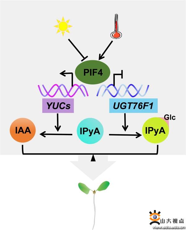 该项研究成果为理解植物是如何根据外界环境变化调控生长素的水平提供了新的思路,发现了在PIF4作用下权衡IAA生物合成与IPyA-Glc形成两者之间关系的重要性,表明了IPyA-Glc形成是控制生长素生物合成的关键“分水岭”事件,并揭示了通过调节IPyA糖基化使植物生长适应环境变化的新机制。