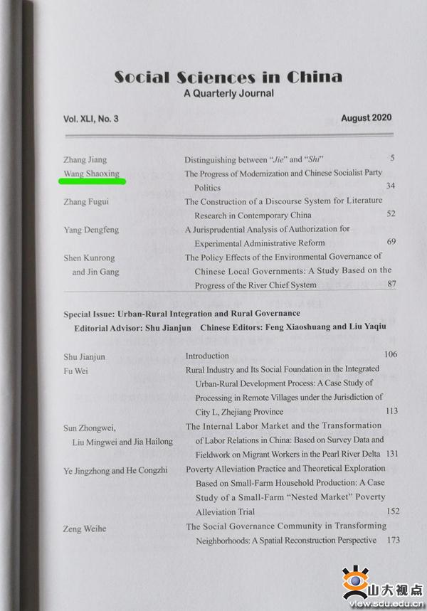 [本站讯]日前,马克思主义学院王韶兴教授的长篇论文“The Progress of Modernization and Chinese Socialist Party Politics”在《中国社会科学》英文版(《Social Sciences in China》)2020年第3期刊发(原文为《中国社会科学》2019年第6期:《现代化进程中的中国社会主义政党政治》)。这是王韶兴教授第3次在《中国社会科学(英文版)》发表论文。到目前,王韶兴教授已经在《中国社会科学》和《中国社会科学(英文版)》发表6篇高水平论文。