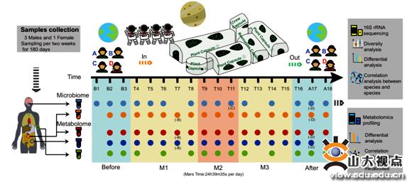 人体微生态是与人体健康密切相关的、十分复杂的微生物生态群落。目前,关于长时间密闭空间内人体微生态稳定性的命题在国际上研究较少,关于密闭空间内生存微生态变化引起的代谢变化及其作用方式了解不够充分。本研究是面向未来人类星际驻留的科学探索,主要解决的是长期密闭空间中人的生存和健康问题。本研究中,四位志愿者在受控生态生命维持系统中连续生活180天,研究团队密切跟踪志愿者身体健康状态,连续采集18个时间点的唾液、粪便、尿液和血浆并进行了微生态、代谢组学分析。