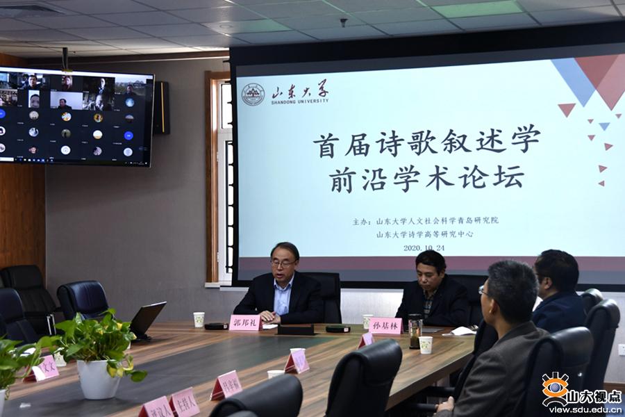 [本站讯]10月24日,由山东大学人文社会科学青岛研究院、山东大学诗学高等研究中心主办的首届诗歌叙述学前沿学术论坛采用线上线下相结合的方式,在青岛校区举行。来自上海外国语大学、南开大学、东南大学、北京大学、山东大学、中国人民大学、安徽师范大学、青岛大学、聊城大学、扬州大学、西华师范大学等高校或单位的五十余位专家学者及山东大学部分研究生等参加会议,就诗歌叙述学前沿学术问题展开了研讨。