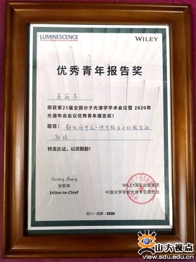 [本站讯]10月30日至11月2日,由中国光学学会和中国化学会主办,四川大学分析测试中心承办的“第21届全国分子光谱学学术会议”暨由中国光学会光谱专业委员会和安特百科(北京)技术发展有限公司主办的“2020年光谱年会” 在四川成都召开。物理学院孙振东教授课题组的博士生马丽莎获得“优秀青年报告奖”。本届大会共颁布两个奖项,十人获优秀青年报告奖,二十人获优秀墙报奖。