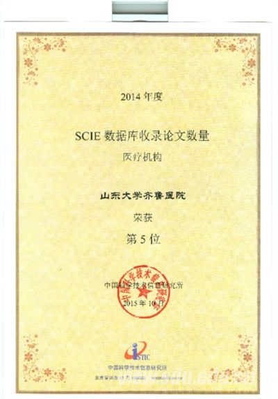 齐鲁医院2014年SCIE收录论文共计448篇,较2013年(375篇,第9位)有了大幅提升。齐鲁医院2014年表现不俗的论文数量为211篇(第5位),2005年至2014年SCI收录论文累计被引用篇数为2208篇(第14位),Medline数据库收录论文数量排名第6位。与2013年相比,齐鲁医院论文成果在各方面科研产出排名均有明显上升。