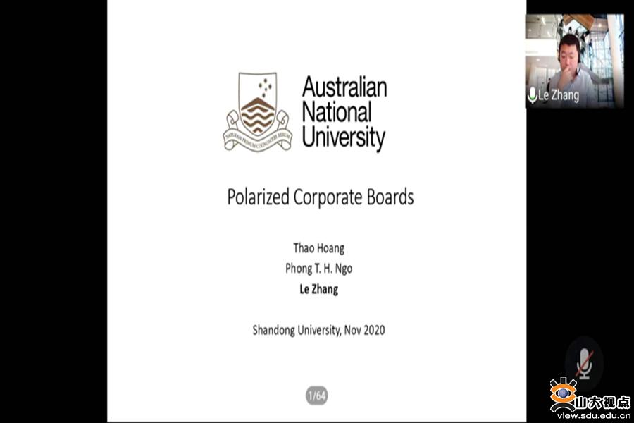 [本站讯]11月26日上午,由经济学院和山东省应用金融理论与政策研究基地联合举办的第五期金融学术讲座以线上会议形式举行。澳大利亚国立大学高级讲师张乐为学院师生带来了题为“Polarized Corporate Board”的报告。讲座由山东大学经济学院金融系张博副教授主持。