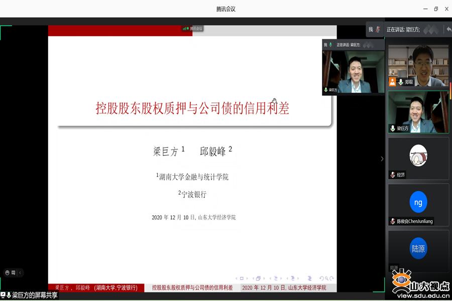 [本站讯]12月10日下午,经济学院举办的第七期金融学术讲座以线上会议形式举行。湖南大学金融与统计学院梁巨方副教授带来题为“控股股东股权质押与公司债的信用利差”的报告。讲座由经济学院助理研究员郑琨主持。