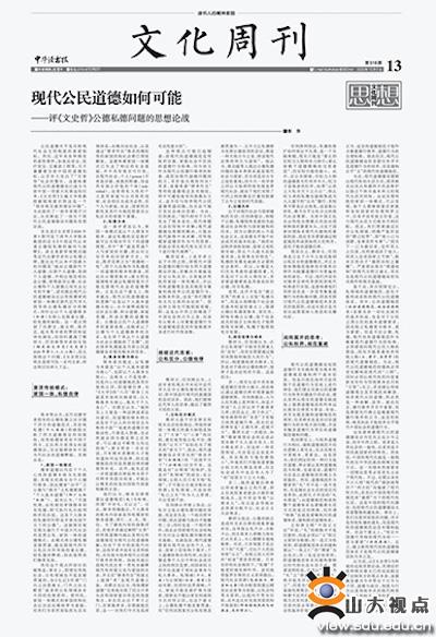 [本站讯]12月9日,《中华读书报》刊发儒学高等研究院郭萍副研究员的文章《现代公民道德如何可能——评<文史哲>》公德私德问题的思想论战》。