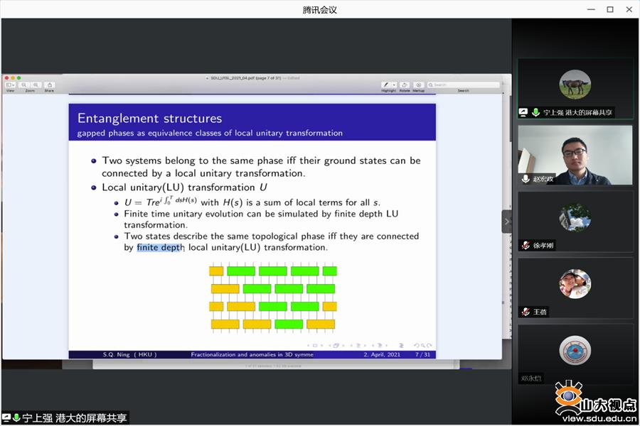 [本站讯]4月2日,第十期“泰山学子讲堂”学术报告会在中心校区举行。2010级物理取向毕业生宁上强、2011级物理取向毕业生张鑫线上分别作题为《Fractionalization and Anomalies in Symmetry-Enriched U(1) Gauge Theories》《Driven-Dissipative Phase Transition in a Kerr Oscillator》的报告。物理学院陈峰教授、郑雨军教授参加活动,泰山学堂2013级物理取向毕业生、现帝国理工学院博士赵宏政主持活动。