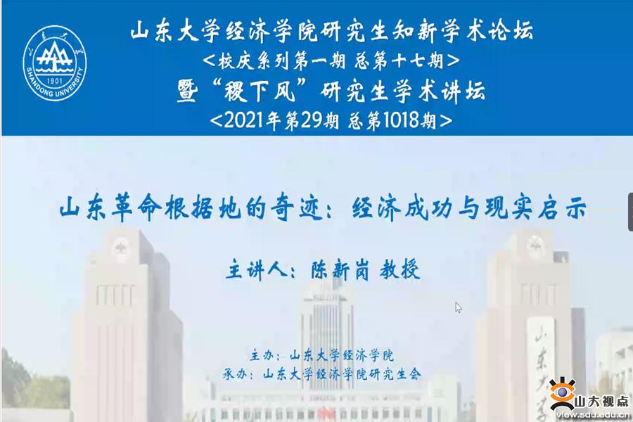 [本站讯]4月15日下午,经济学院第十七期研究生知新学术论坛暨“稷下风”研究生学术讲坛以线上会议形式举行。经济学院陈新岗教授作了主题为“山东革命根据地的奇迹:经济成功与现实启示”的报告。论坛由学院党委副书记林竹主持。
