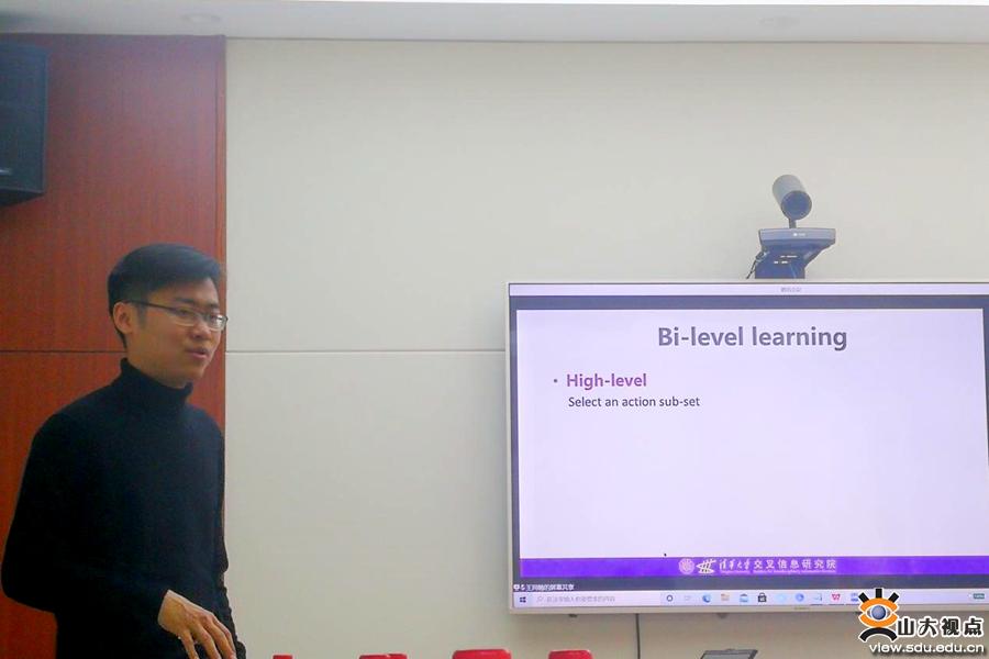 王同翰首先对监督学习、非监督学习、半监督学习和强化学习这几种主要的机器学习进行了阐述,然后通过介绍围棋人工智能AlphaGo和掌握复杂即时策略游戏StarCraft的智能体AlphaStar引入强化学习的概念,并简要阐述了强化学习的定义。随后,王同翰对于机械臂的学习过程这一实例进行了详细阐述,同时介绍了强化学习的范式,并进一步阐述了目前强化学习的几大研究热点,包括MARL(Multi-Agent Reinforcement Learning)及其研究现状,并由CTDE(Centralized training with decentralized execution)方法的缺点引出Role-Based的研究方法,进而介绍了该种研究方法取得的领先成果。最后,王同翰回答同学们提出的问题,并分享了自己的科研经验。