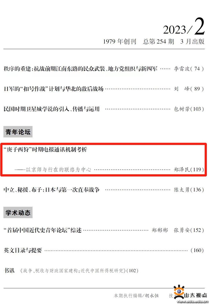 [本站讯]近日,历史文化学院李发根研究员撰写的“黄河故道之变与土地权属之争(1855—1937)”和郑泽民博士后撰写的“‘庚子西狩’时期电报通讯机制考析——以京师与行在的联络为中心”在《近代史研究》2023年第2期同时发表。