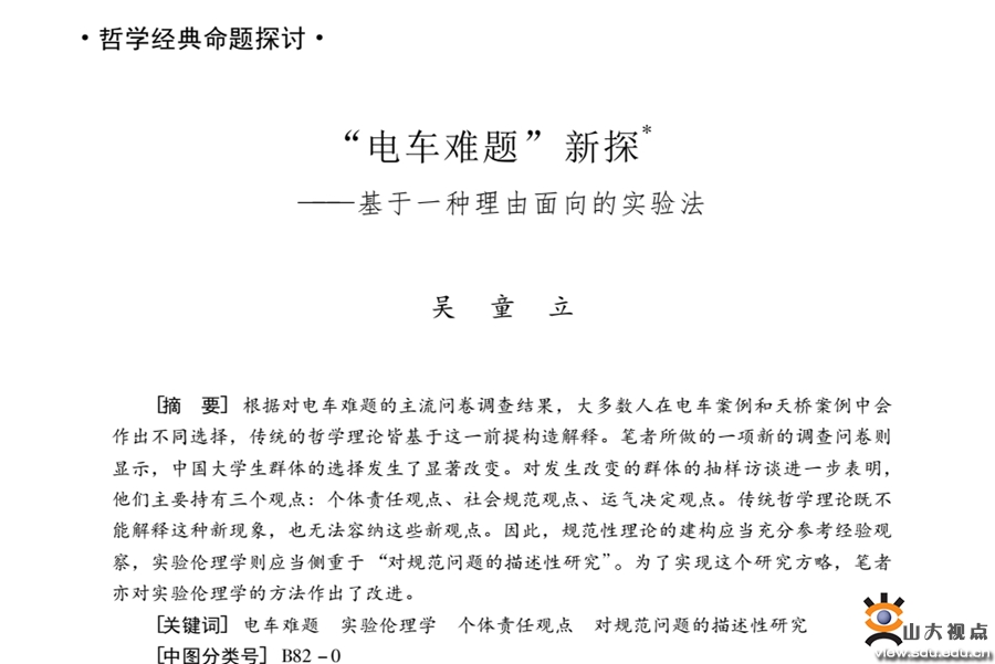 [本站讯]近日,哲学与社会发展学院副教授吴童立所撰写的“‘电车难题’新探——基于一种理由面向的实验法”一文在《哲学研究》2023年第2期上发表。
