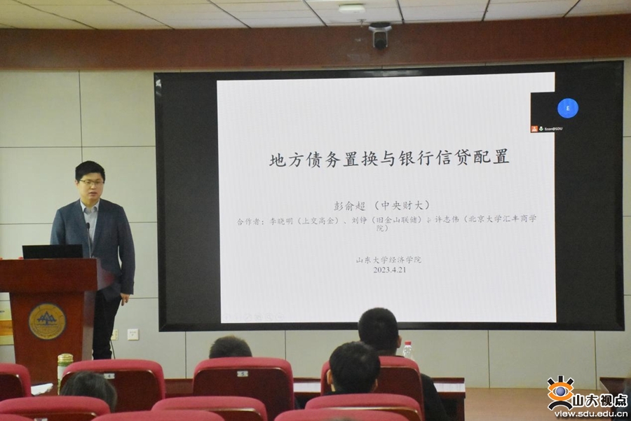 [本站讯]4月21日,经济学院于中心校区知新楼举办第十四期宏观经济与金融论坛。中央财经大学金融学院副院长彭俞超作了题为“地方债务置换与银行信贷配置”的学术报告。会议由经济学院助理研究员张仁斌主持,采取线上线下相结合的形式,学院部分师生参会。