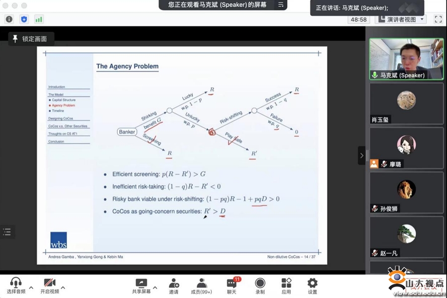 [本站讯]4月26日,经济学院线上举行数字经济发展与治理青年系列讲座第六期。华威大学商学院金融学副教授马克斌作了题为“Non-dilutive CoCo Bonds: A Necessary Evil?”的学术报告。会议由经济学院院长林平教授主持。