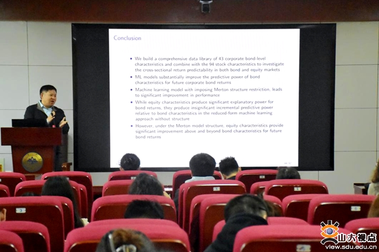 [本站讯]5月5日,经济学院第302期高级经济学讲座于中心校区知新楼举行,中央财经大学教授姜富伟作了题为“Predicting Corporate Bond Returns: Merton Meets Machine Learning”的报告。讲座由经济学院副院长张群姿主持,部分师生参会。