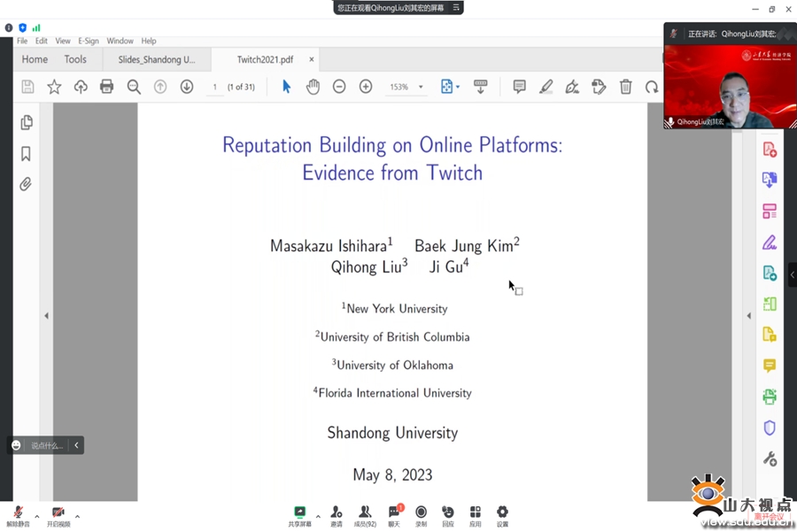 [本站讯]5月8日,经济学院第303期高级经济学讲座以线上形式举行,美国俄克拉荷马大学经济系教授刘其宏作了题为“Reputation Building on Online Platforms: Evidence from Twitch”的报告。讲座由山东大学经济学院副教授张剑虎主持,部分师生参会。