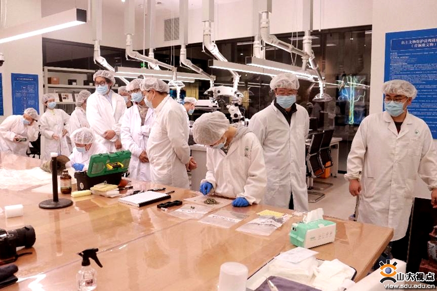 5月9日下午,研究工作正式开展。山东大学历史文化学院教授邓聪、博士后杨琳带领工艺技术组的3名博士研究生和科研助理,主要通过超景深显微镜观察、高倍数码摄影、精密测量及绘图等方式,对三星堆玉石器的加工工艺信息进行提取;山东大学历史文化学院教授马清林带领文保检测组的2位博士研究生和2位硕士研究生,对玉器样品做表面清理、拉曼光谱分析、显微镜观察等,同时对6件玉器碎片、11个碎土块和表面附着物进行了允许范围内的科学取样;中国社会科学院考古研究所研究员刘煜、助理研究员张周瑜作为外聘专家,协助山东大学主要针对三星堆玉石器的金属附着物展开分析研究。