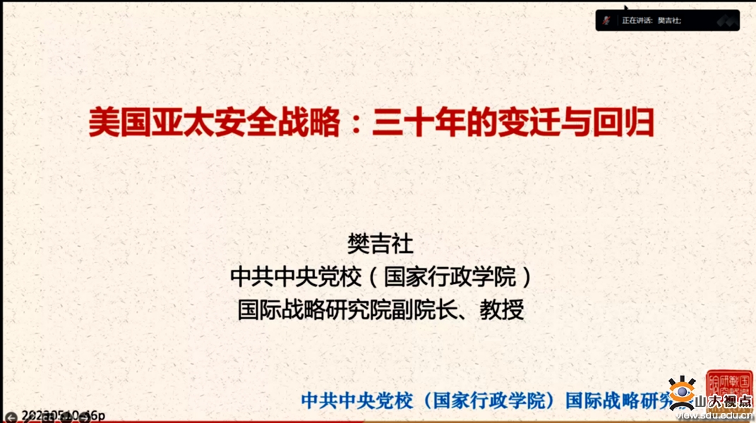[本站讯]5月10日晚,由政治学与公共管理学院、山东大学亚太研究所联合主办,亚太所大国关系与地区安全研究中心承办的“社科与人文”系列讲座第十八讲在线上举办,讲座题目为“美国亚太安全战略:三十年的变迁与回归”。中共中央党校国际战略研究院副院长樊吉社担任主讲人,亚太研究所大国关系与地区安全研究中心主任王鹏权主持学术讲座。