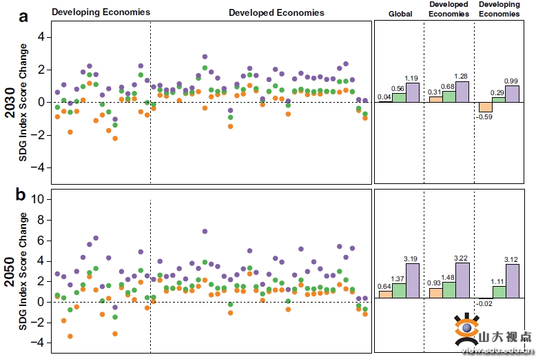 阐释了电力转型的区域异质性影响。电力转型对可持续发展目标进展的影响存在较大的区域异质性。电力转型能够提高发达国家的整体可持续发展水平,但是在基于化石能源的情景下,将降低发展中国家的可持续发展目标相关指数得分。比如,在SSP5+RCP6.0情景下,发展中国家继续大量使用化石燃料发电,其可持续发展目标指数平均得分将下降(2030年为0.59,2050年为0.02)。