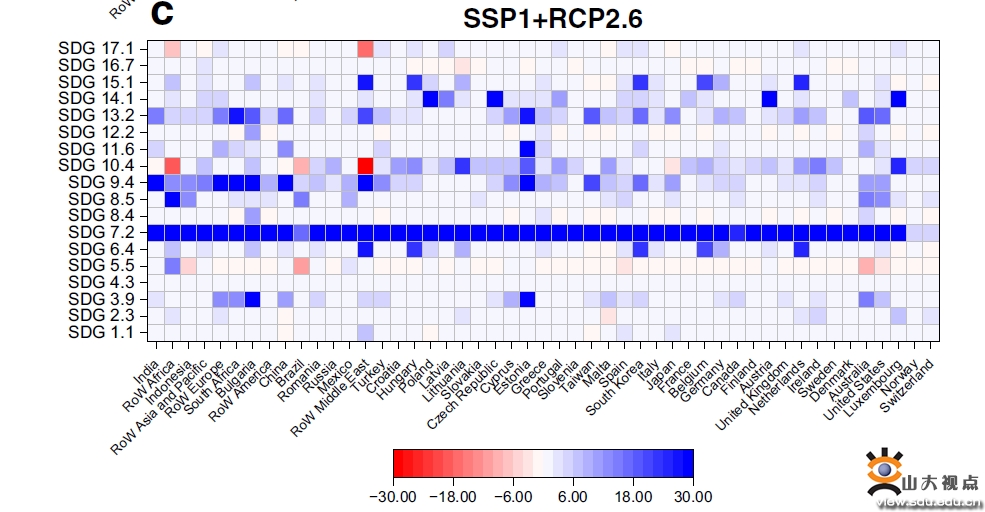 阐明了不同可持续发展目标之间的协同效应和权衡取舍。关于协同效应,情景SSP1+RCP2.6显示,到2100年,电力转型可使超过90%的经济体同时提高超过15个子目标的分数。但是,个别子目标与整体可持续发展目标之间存在取舍。例如,南非的总体可持续发展目标得分将在2100年提高10.65,但由于转型期间金属等材料使用量的增加,其SDG 8.4(提高消费和生产中的资源利用效率)得分将下降0.24。