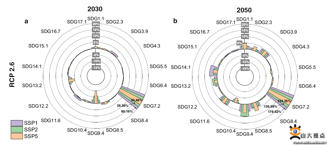 揭示了电力转型对全球可持续发展目标进展的影响。研究发现,电力转型总体上能够提高全球可持续发展水平。在严格的应对气候变化情景(RCP 2.6情景)下,电力转型可使2015至2100年间全球可持续发展水平提高10%以上。然而,短期内,化石电力的持续增长可能会阻碍全球可持续发展目标的进展。例如,在SSP5情景下,2030年全球SDG整体得分将下降0.2%-1%。