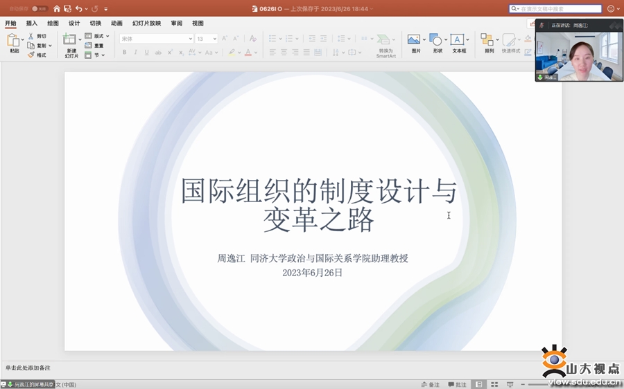 [本站讯]6月26日,山大国政博士生学术工作坊第六期于线上举行。同济大学政治与国际关系学院助理教授周逸江以“国际组织的制度设计与变革之路”为题作讲座。山东大学政治学与公共管理学院教授李慧明主持讲座,国际政治专业2022级博士研究生参与交流。