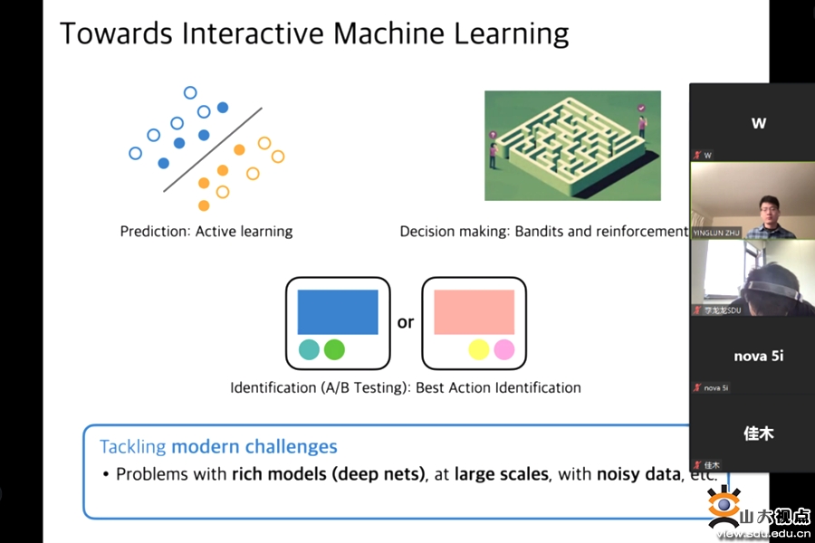 会议中,朱英伦展示了如何通过设计新颖的human-in-the-loop算法来达到较好的计算效率,将深度学习系统和交互式学习相联系,详细介绍了交互式机器学习领域的未来方向,鼓励同学们积极开展跨学科合作。在交流互动环节,针对同学们提出的问题,朱英伦一一进行了解答。
