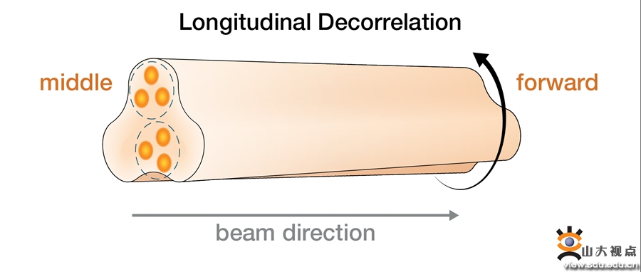 山东大学前沿交叉科学青岛研究院粒子科学技术研究中心的陈震宇教授和聂茂武副研究员是该论文的主要作者(Principal Authors),对实验分析做出了重要贡献。值得指出的是,STAR实验组的测量结果与PHENIX实验组的已发表实验测量结果有较大差别,该差别被认为来自于集体流退关联效应。由于初态涨落效应,沿着碰撞系统纵向方向(束流方向)会发生类似“吸管扭曲”的退关联现象,如图2所示。粒子中心陈震宇教授、易立教授和聂茂武副研究员正在STAR实验组进行RHIC能区集体流退关联的系统测量,该测量将为STAR和PHENIX实验组测量结果的差异提供直接定量依据。