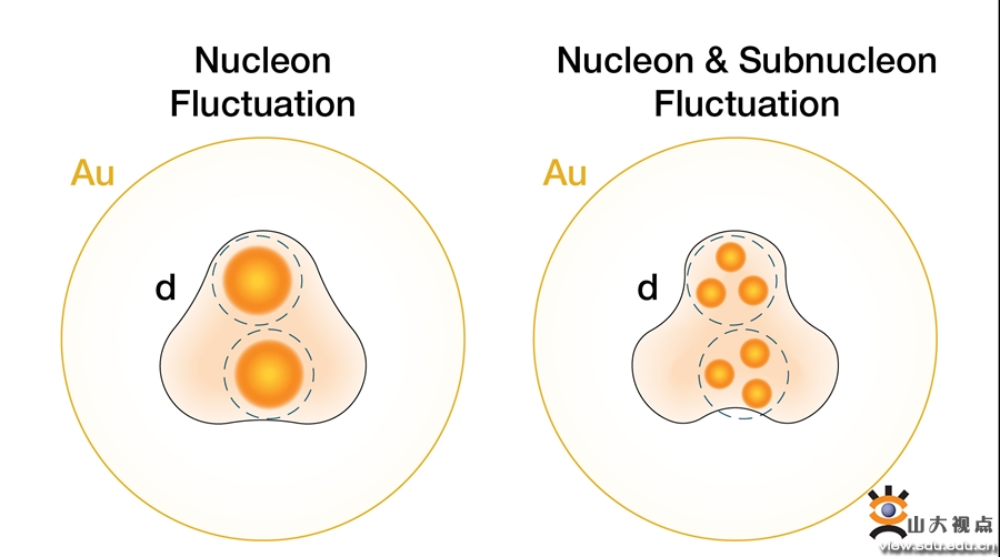 图1 包含核子涨落的氘核(左)和包含亚核子涨落的氘核(右)对三角流贡献的示意图