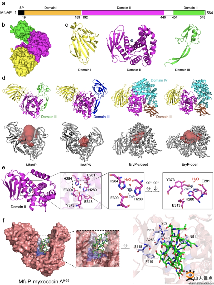 图2 |MfuP的晶体结构解析。(a)MfuP的一级结构示意图;(b)以surface模式展示的MfuP整体结构;(c)MfuP三个结构域的cartoon模型;(d)MfuP、IloAPN(PDB:4FGM)以及EryP封闭构象(PDB:7V9N)和开放构象(PDB:7V9Q)的cartoon模型;(e)MfuP活性中心锌离子与活性位点关键氨基酸的相互作用示意图;(f)MfuP-myxococin A9-35的结合模式图