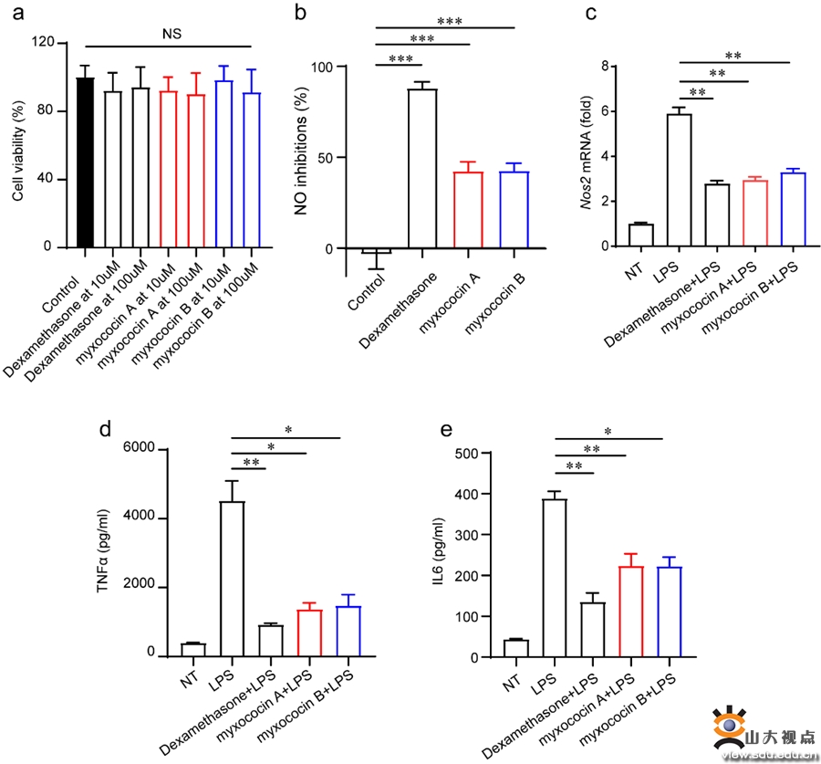最后,作者对myxococin A和myxococin B进行了生物活性的检测,以LPS诱导的小鼠单核巨噬细胞RAW264.7为模型,发现其对NO的释放和诱导型NO合酶(Nos2),以及促炎细胞因子TNFα、IL6和IL1β转录水平和蛋白水平均具有明显的抑制效应表明其良好的抗炎活性,且未检测到细胞毒性图3)。该特性表明其具有进一步开发成为抗炎药物先导化合物的潜力,且其抗炎活性机制也值得进一步研究。