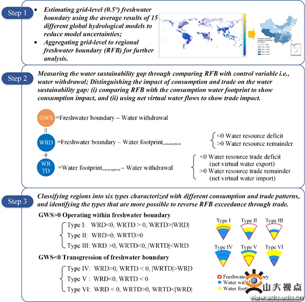 我国水资源空间分配不均,且与社会经济要素分布欠匹配,是我国最主要的水安全问题之一,已经严重制约当前经济社会发展。为此,判断我国不同地区水资源利用是否处于水资源承载能力范围之内显得尤为重要。水行星边界从地球系统观出发为评估水资源承载力提供了全新视角,但基于水行星边界框架的区域水资源承载力评价模型仍存在较大不确定性。另一方面,贸易一直被认为能在缓解区域水资源超载中发挥重要作用,但目前缺少研究框架以全面评估贸易对区域水资源超载的影响。为此,本文基于ISIMIP2a平台下的15种全球水文模型绘制了高空间分辨率的水资源承载力地图,通过多模型的应用降低了计算的不确定性。在此基础上,本文提出了一种全新的框架,用来评估区域贸易对缓解本地水资源超载的影响效果和潜力。
