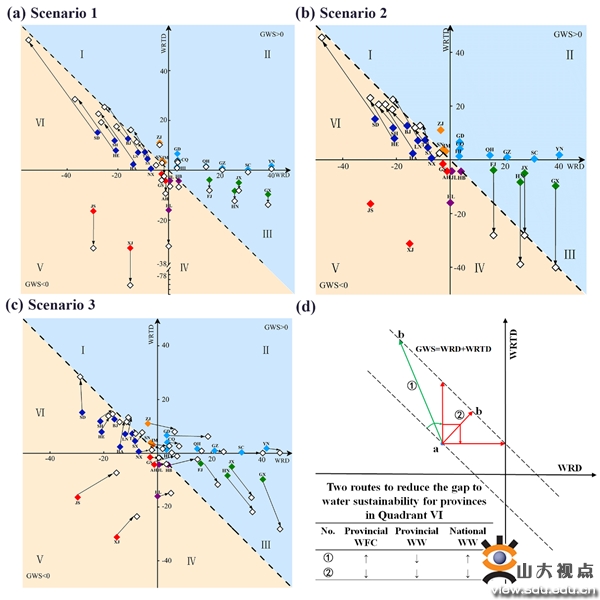 (a)情景1,象限VI省份按当前贸易模式增加进口;(b)情景2,象限VI省份仅从象限III省份增加进口;(c)情景3,在情景2的基础上减少各省用水强度;(d)象限VI省份回到水资源边界内的两种路径