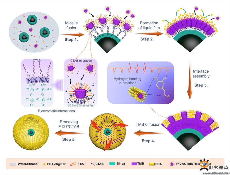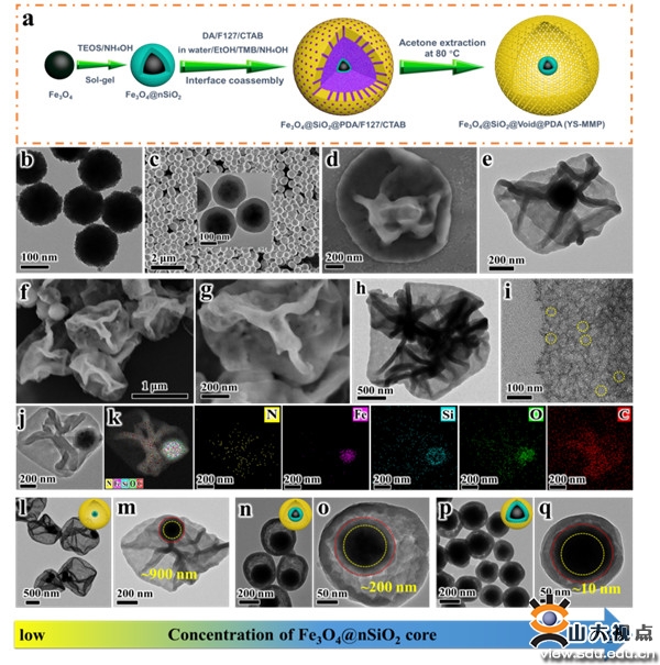 [本站讯]近日,海洋学院陈景帝教授团队利用双模板诱导界面组装法,成功制备具有空腔尺寸可调的卵黄壳磁性介孔聚多巴胺囊泡以增强光热抗菌作用,并进一步揭示其界面组装和聚合机理。研究成果“Dual-template Induced Interfacial Assembly of Yolk-shell Magnetic Mesoporous Polydopamine Vesicles with Tunable Cavity for Enhanced Photothermal Antibacterial”发表在国际化工领域权威期刊Chemical Engineering Journal(中科院一区,影响因子15.1)。山东大学海洋学院教授陈景帝、上海大学教授苏佳灿,电子科技大学研究员岳秦为该论文共同通讯作者,山东大学助理研究员潘盼盼为本论文第一作者,山东大学为第一完成单位。