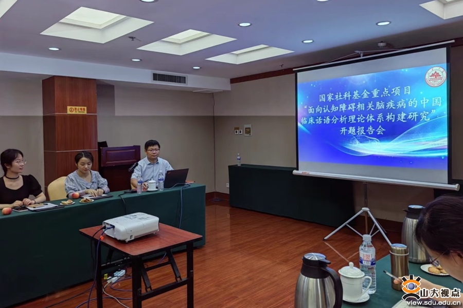 [本站讯]8月19日,由山东大学马文教授主持的国家社科基金重点项目“面向认知障碍相关脑疾病的中国临床话语分析理论体系构建研究”开题报告会在济南珍珠泉宾馆举行。浙江大学外国语学院教授马博森、山东大学齐鲁医院儿科副主任、教授曹爱华、山东大学第二医院神经内科主任医师王萍、山东大学外国语学院教授时秀娟、董记华、卢敏、副研究员张昊和博士王亚琪等10余位专家学者参会。开题报告会由山东大学外国语学院副院长、山东大学临床神经语言学研究中心主任、教授马文主持。