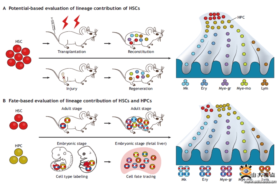 [本站讯]近日,生命科学学院教授刘峰带领的造血干细胞发育与再生团队在发育生物学领域知名期刊Development上发表了题为“Revisiting the lineage contribution of hematopoietic stem and progenitor cells”的综述论文,文中回顾了造血干细胞的发现、定义以及经典的造血层级结构模型,重点梳理和总结了近期利用单细胞多组学技术和全新谱系示踪技术揭示的造血干细胞和造血祖细胞的谱系分化特征。经典的造血层级结构模型主要是基于非生理状态下的功能测定(移植实验和克隆形成实验),这些测定评估了造血干细胞的分化潜能。随着生理状态下的谱系示踪策略的应用,胚胎期和成体期血液发育的主要贡献者被重新认定为造血祖细胞,而非造血干细胞(图1)。基于近期研究的梳理有助于重新定义稳态和应激条件下胚胎期和成体期血液发育的起源以及维持。生命科学学院博士后高素伟和张一帆为共同第一作者,刘峰教授为通讯作者,山东大学为第一作者和通讯作者单位。